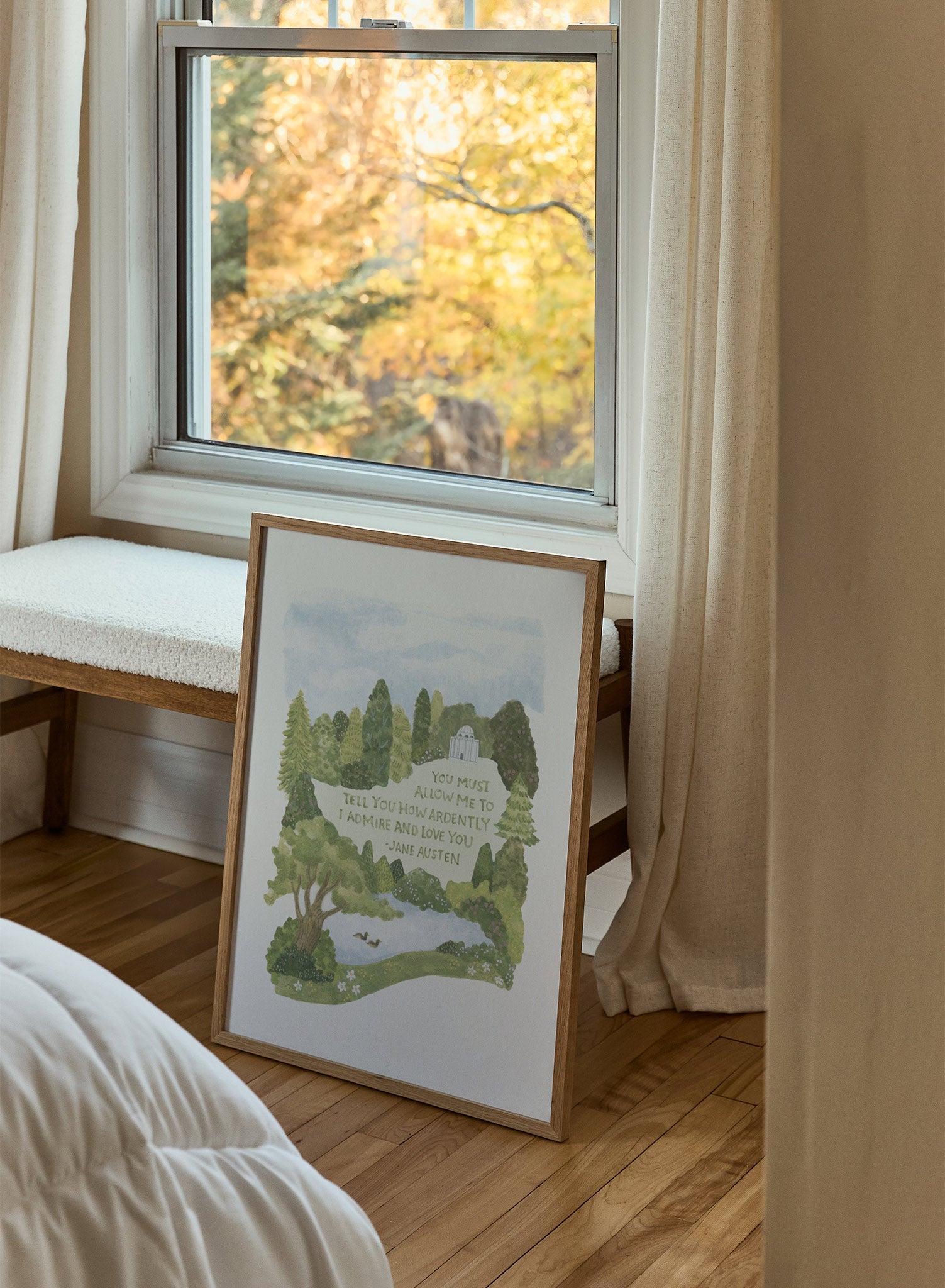 A serene landscape unfolds in this print, where lush greenery frames a tranquil pond. A pair of swans glide gracefully across the water, surrounded by towering trees and a distant gazebo. The scene is anchored by a heartfelt quote from Jane Austen, elegantly woven into the foliage, inviting viewers to pause and reflect.