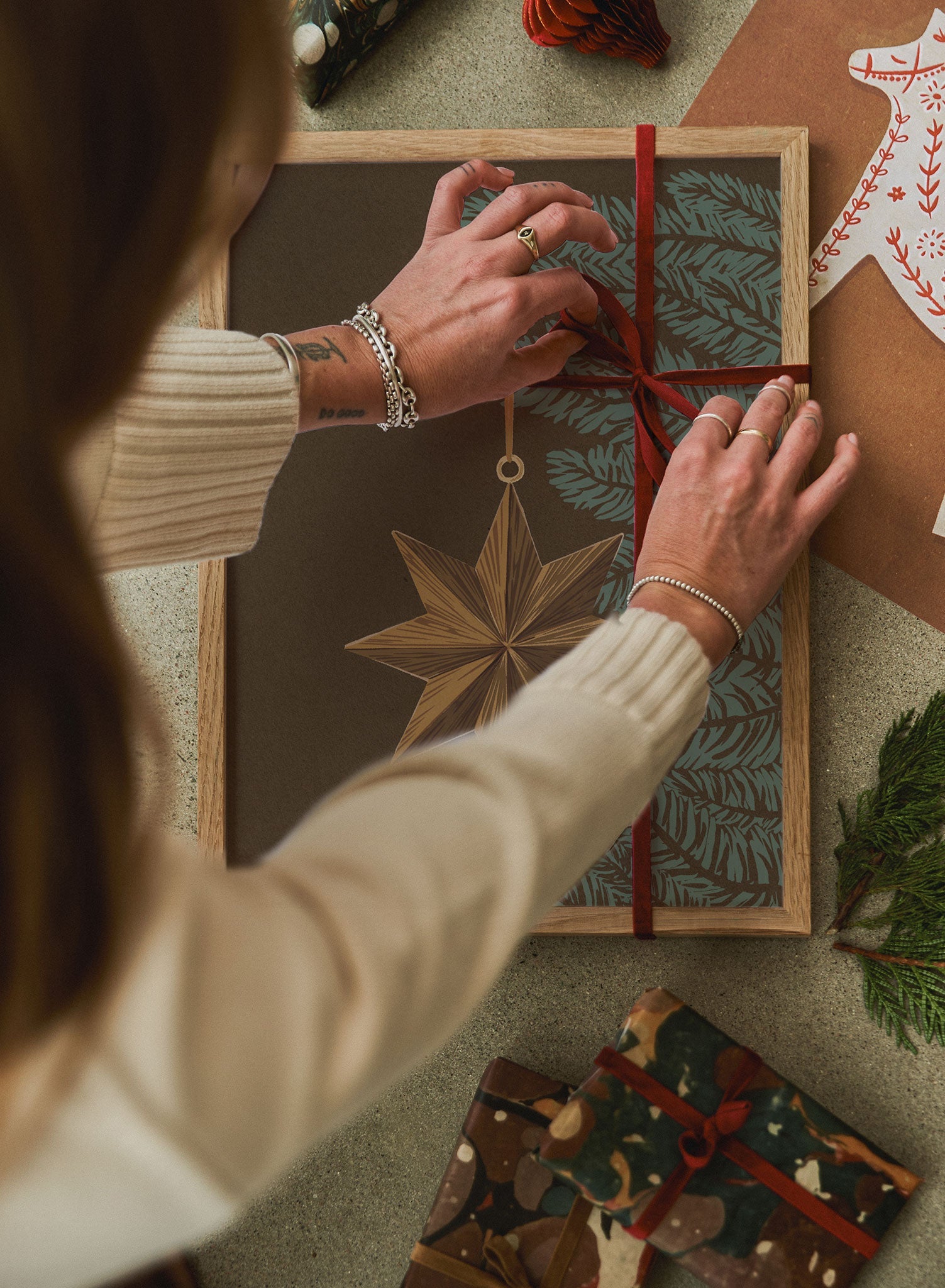 This print captures a serene winter scene with a golden star ornament hanging gracefully against a backdrop of lush evergreen branches. The star, with its intricate lines and warm hue, stands out against the deep, earthy background, evoking a sense of seasonal warmth and tradition. The composition is both simple and elegant, drawing the eye to the harmonious interplay between the ornament and the natural elements.