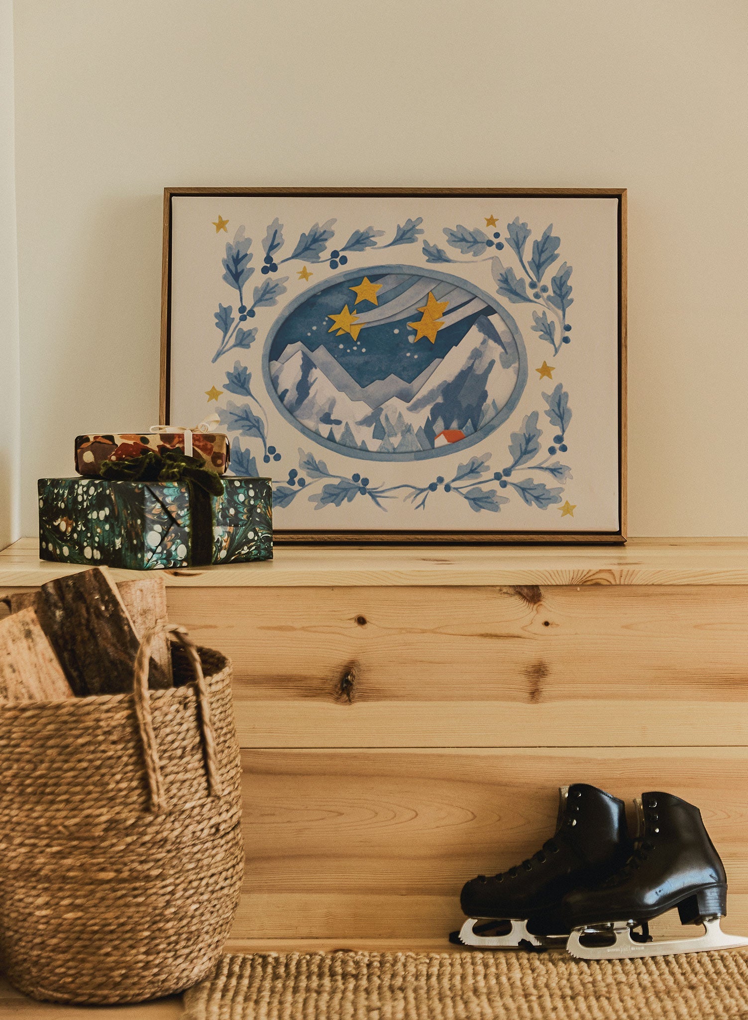 This print captures a serene winter night, where snow-capped mountains rise majestically under a deep blue sky. Golden stars twinkle above, casting a gentle glow over the scene. Encircling the central image, a wreath of blue leaves and berries adds a touch of nature’s elegance, while a small red-roofed cabin peeks from the snowy landscape, offering a hint of warmth and shelter.