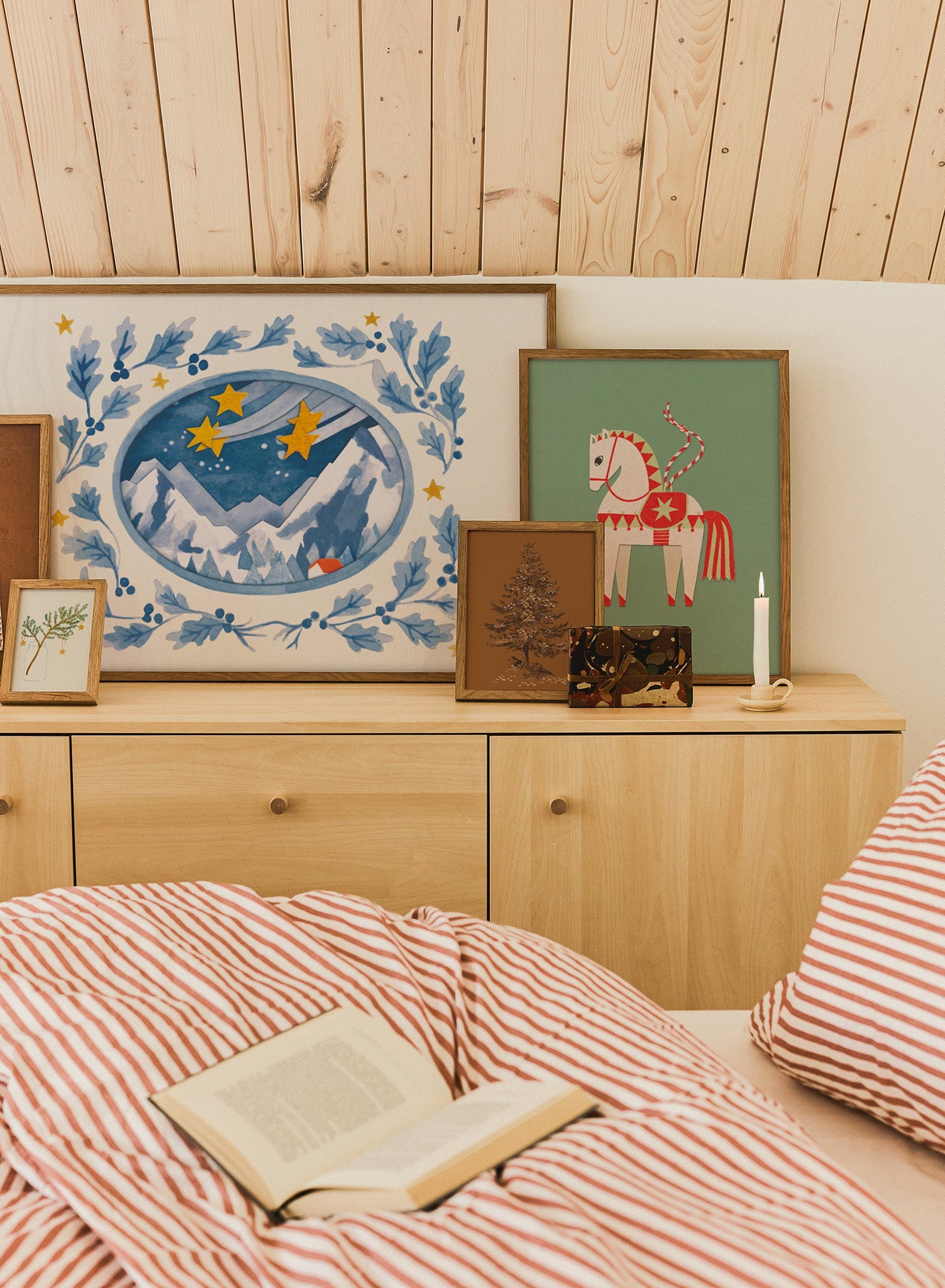 Perfect for a cozy living room or a tranquil bedroom, this print pairs beautifully with soft textiles and natural wood accents. Consider placing it above a fireplace or as part of a gallery wall to bring a touch of winter’s quiet beauty indoors. Complement with fairy lights or candles to enhance its warm, inviting atmosphere.