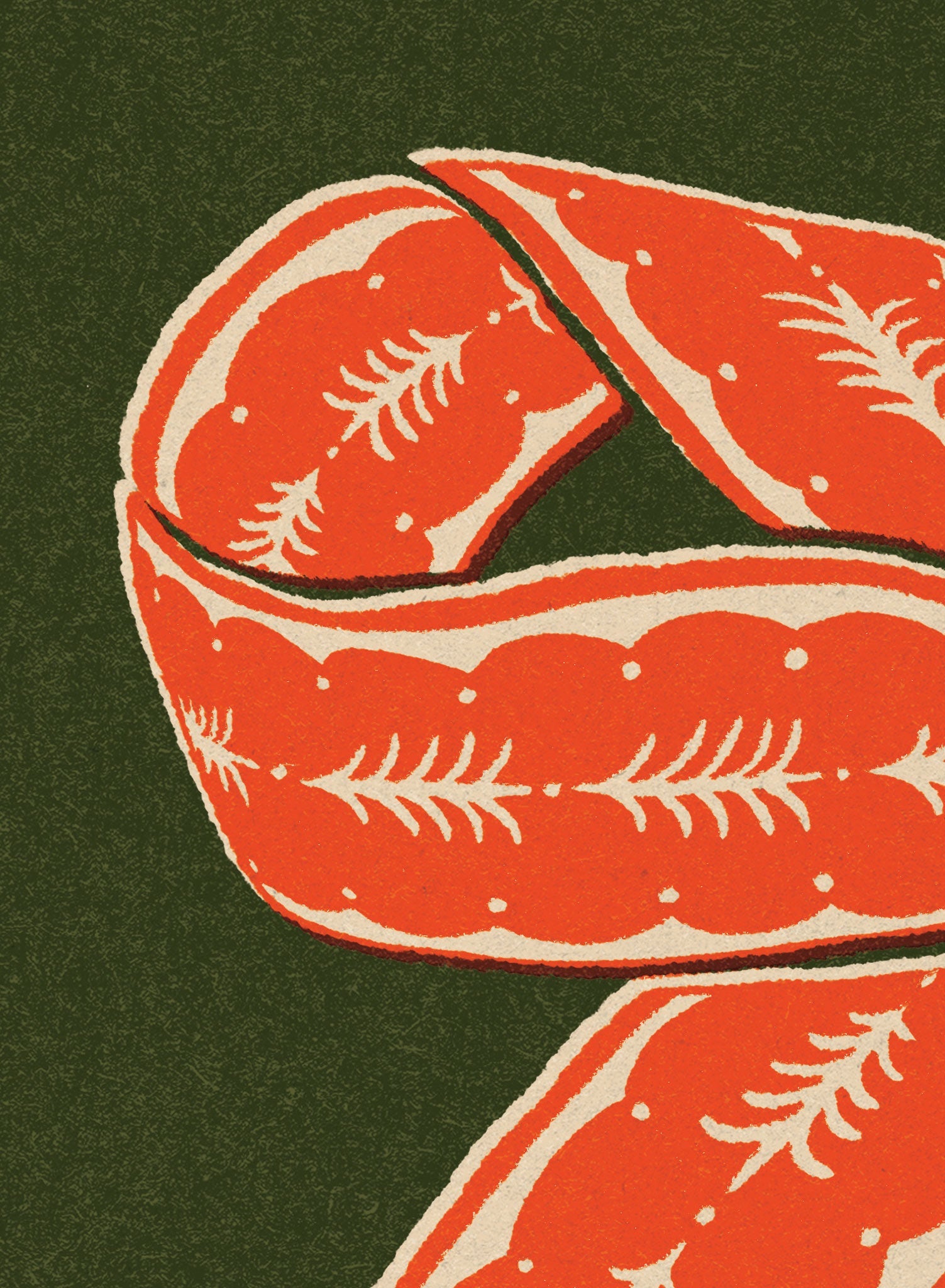 This print features a striking red bow adorned with intricate white patterns, set against a deep green background. The bow's flowing ribbons and detailed design evoke a sense of festive elegance, capturing the spirit of holiday cheer. Its bold presence and classic color combination make it a standout piece for seasonal decor.