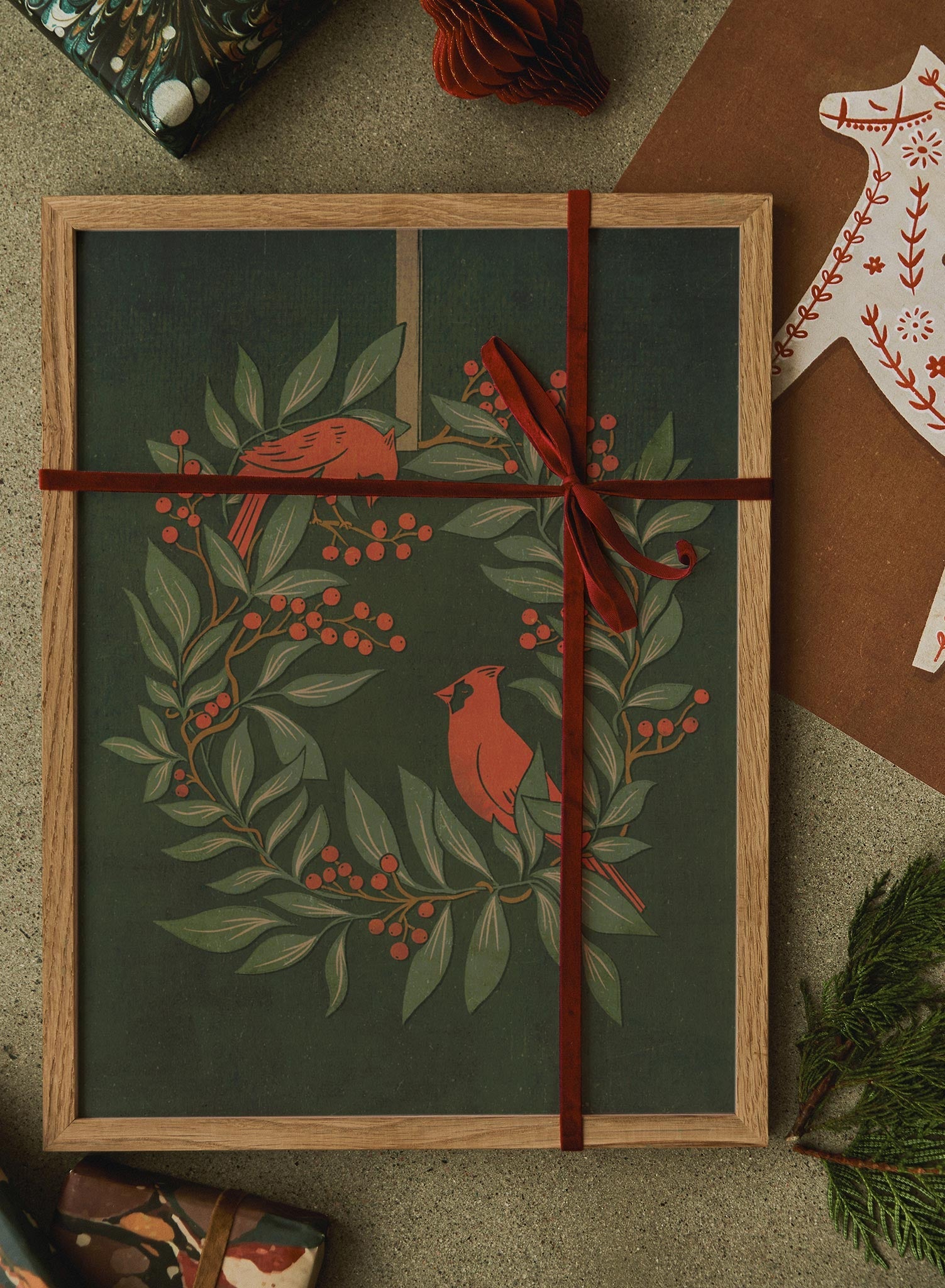 This print captures a serene winter scene with two vibrant cardinals perched amidst a lush wreath of green leaves and red berries. The deep green background enhances the vivid red of the birds and berries, creating a striking contrast that draws the eye. The composition is balanced and harmonious, evoking a sense of calm and natural beauty.